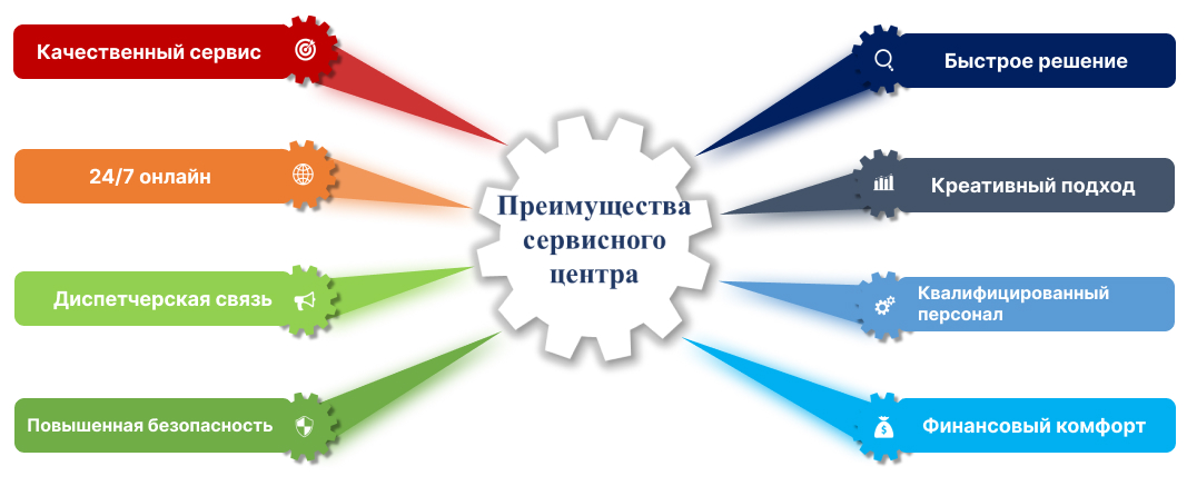 В сервис центре создан единый колл-центр на основе графика 24/7, в котором клиент может получать информацию или оставлять заявку по телефону в любое время суток. Оставленные заявки будут устранены рабочей группой в течение 3 рабочих дней.